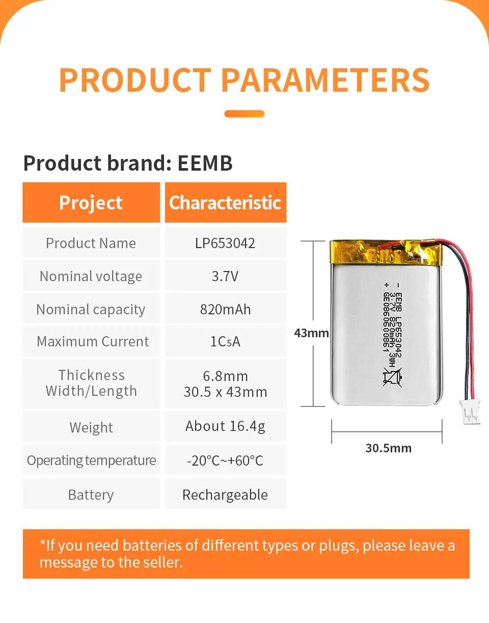 Lp653042 3.7V 820mAh (rechargeable)