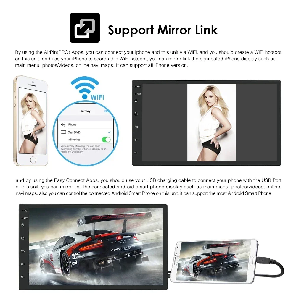 2G RAM 32G ROM Carplay: AD7002CPwith 1*Wire Harness Cable,1*RCA Cable with 9 wires(supports Video Output),1*CAM-VIN wire,1*External Mic,2*USB wire,1*GPS Antenna,1 sets Metal Bracket,1*Front plastic frame.