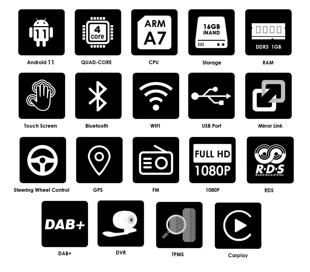 1G RAM 16G ROM Carplay & 1G RAM 32G ROM Carplay: AD7001CPwith 1*Wire Harness Cable,1*RCA Cable with 9 wires(supports Video Output),1*CAM-VIN wire,1*External Mic,2*USB wire,1*GPS Antenna,1 sets Metal Bracket,1*Front plastic frame.