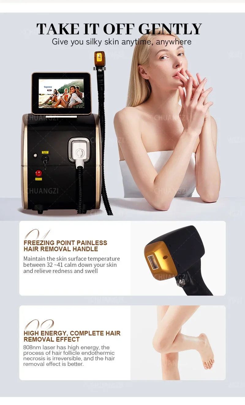 808nm Diode hair removal machine freeze through technological innovation, so that the treatment of head to negative temperature, unlike other burns the skin, to better protect the skin, hair follicle melanin by specific wavelength of absorption, and the heat exchange to destroy hair follicle, the energy can be shot down into the hair follicles within the hair follicle is destroyed energy decomposition, so that the hair follicles to stop growing, because the energy about 15% of the skin can penetrate the dermis layer, the epidermis and more with melanoma of the hair follicle deep through the heat damage to hair follicle degeneration and atrophy; achieve permanent hair removal results.