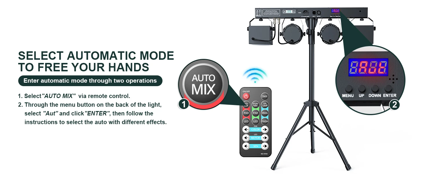 2. Through the menu button on the back of the light, select "Aut"and click "ENTER", then follow the instructions to select the auto with different effects.