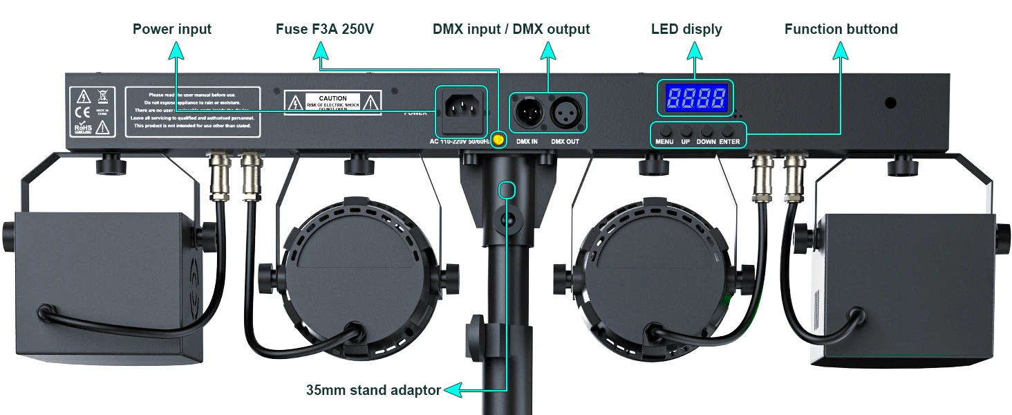 2. Press the "ENTER"button and use the "UP"and"DOWN" buttons to select setup 3/6 or 15 DMX channel mode.