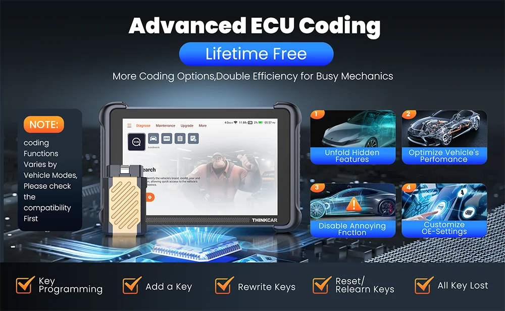 ThinkScan 689BT OBD2 diagnostic device adds ECU online coding, power balance, refresh hidden functions, reset adaptive data, matching replacement components, adjust OE settings. For example: 1. Change the colour of the interior lighting. 2. Auto-hold on/off 3. Adjust dashboard kit 4. Disable automatic start/stop etc. (Note: coded functions vary depending on model and year of manufacture)